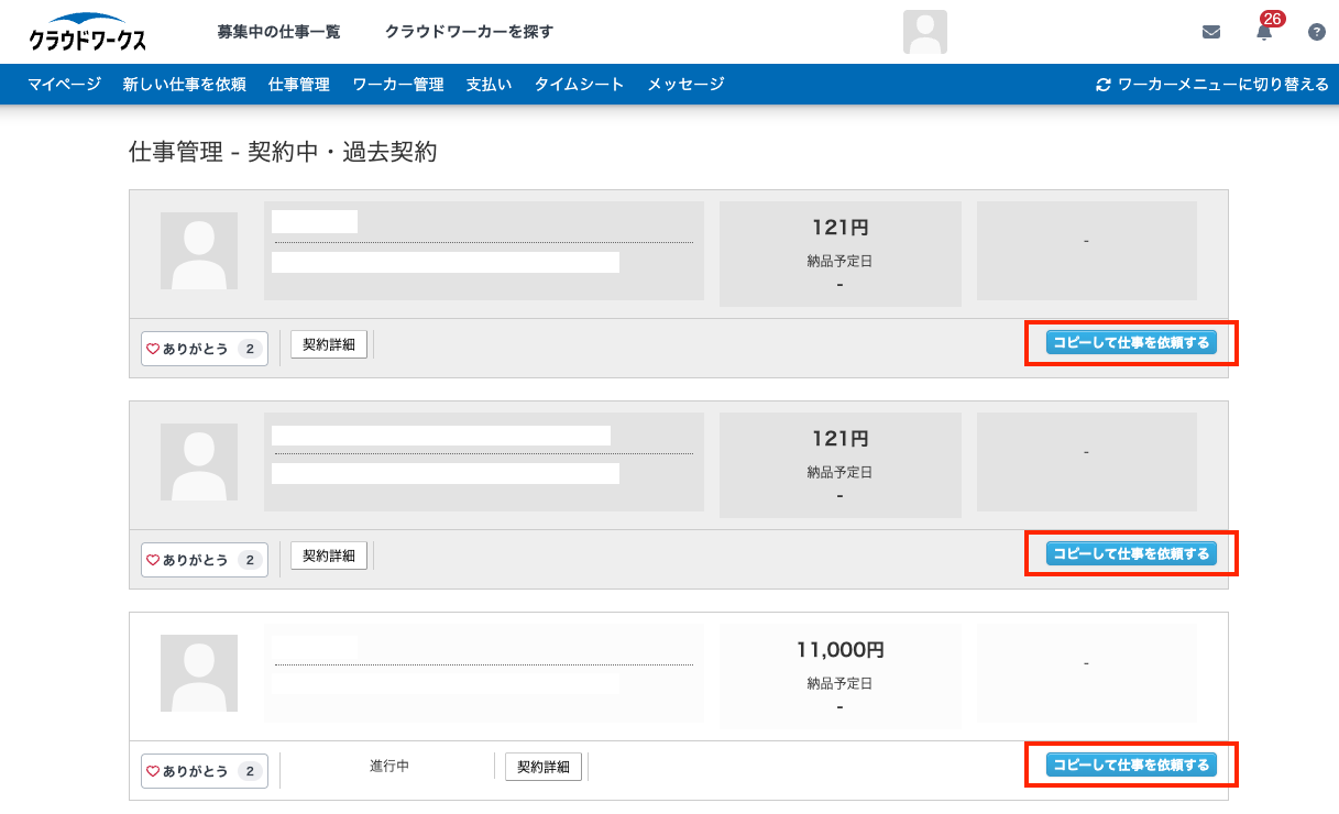 - 上記のいずれかの画面で、「コピーして仕事を依頼する」ボタンを選択