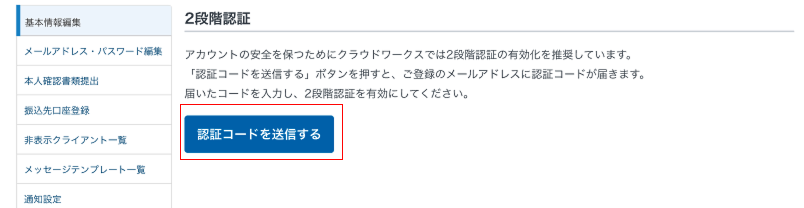 1. 2段階認証を設定するため、「認証コードを送信する」を選択